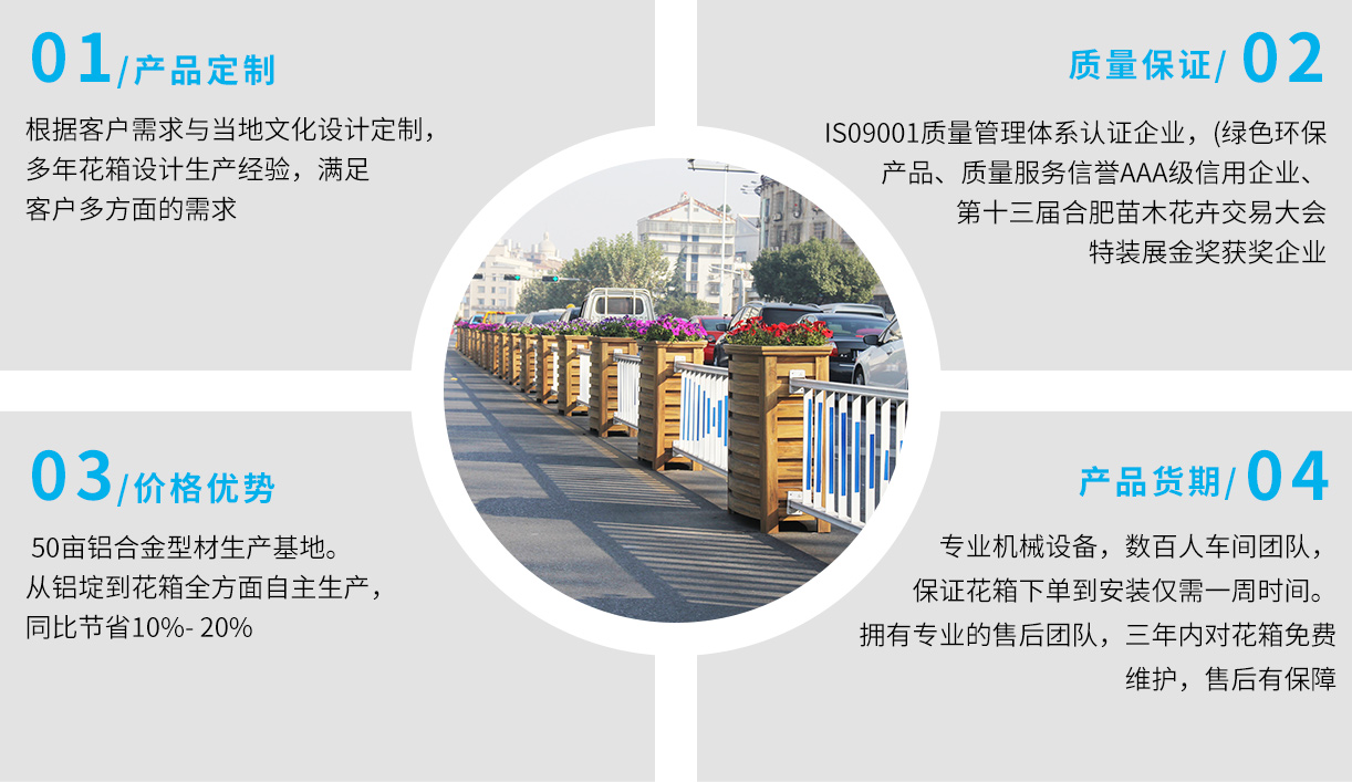 •       上海曦信環(huán)保科技股份有限公司成立于2013年,是一家專業(yè)的馬路花箱供應(yīng)商。本公司自成立以來(lái),經(jīng)歷了奠定基礎(chǔ),穩(wěn)步發(fā)展的過(guò)程。品牌已形成市場(chǎng)優(yōu)勢(shì),現(xiàn)正處于乘勢(shì)而上發(fā)展壯大的階段。創(chuàng)立先進(jìn)的經(jīng)營(yíng)理念和企業(yè)文化,生產(chǎn)經(jīng)營(yíng)規(guī)模不斷發(fā)展壯大。公司主要從事馬路花箱,花箱護(hù)欄,木紋鋁合金花箱,座椅花箱,鋁板花箱、不銹鋼花箱、鋁合金護(hù)欄、鋁合金葡萄架,公園座椅,戶外果皮箱垃圾桶、鋁合金葡萄架等金屬建材產(chǎn)品的生產(chǎn)和銷(xiāo)售...
